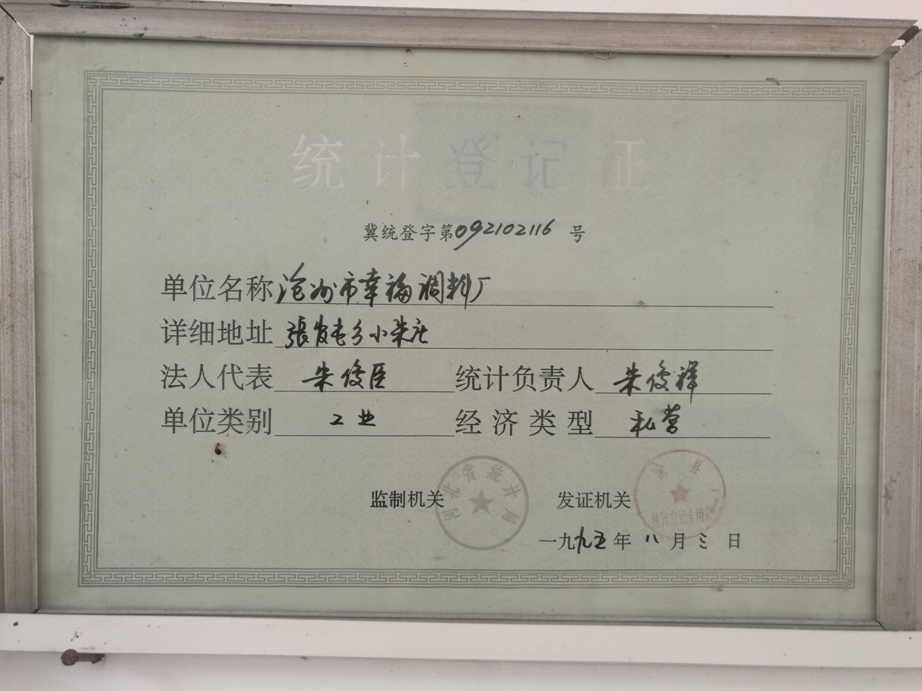 統(tǒng)計登記證 冀統(tǒng)登字第092102116號 單位名稱滄州市幸福調(diào)料廠 詳細地址張官屯鄉(xiāng)小朱莊 發(fā)證機關:滄縣統(tǒng)計局 監(jiān)制機關:河北省統(tǒng)計局 一九九五年八月三日