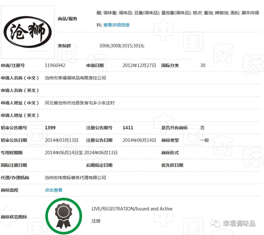 幸福調味品自創(chuàng)辦30多年以來,在工商部門指導下,充分認識到商標品牌的重要性,始終堅持走創(chuàng)品牌的路子。公司的“康頌”商標于1997年在30類,糖、茶、糕點、調味品類獲核準注冊后,并根據(jù)市場需要,先后又注冊了包括“滄獅”中文及拼音在內的等商標;形成了涵蓋多類別、多商品、多層次的商標品牌庫。